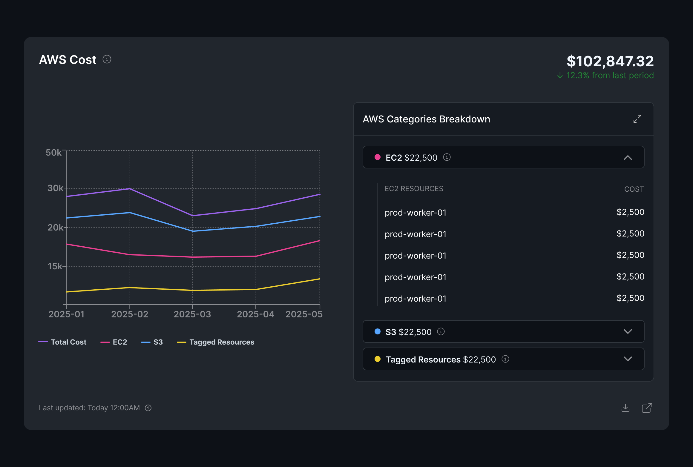 Track budgets, usage, and compute costs across teams to drive accountability and reduce team spend.