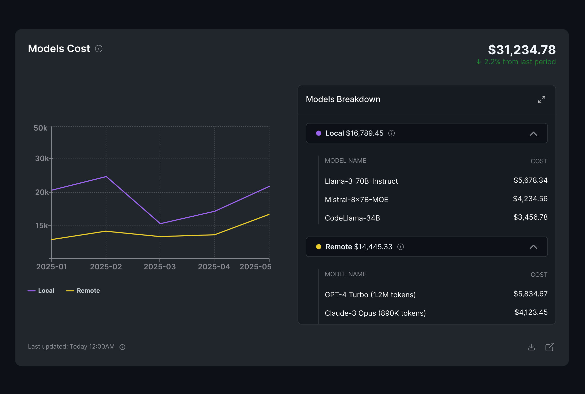 Detailed cost visibility & forecasting: Gain full transparency into spend, usage, and budgets to cut $1M+ in infrastructure and vendor costs per LLM project.