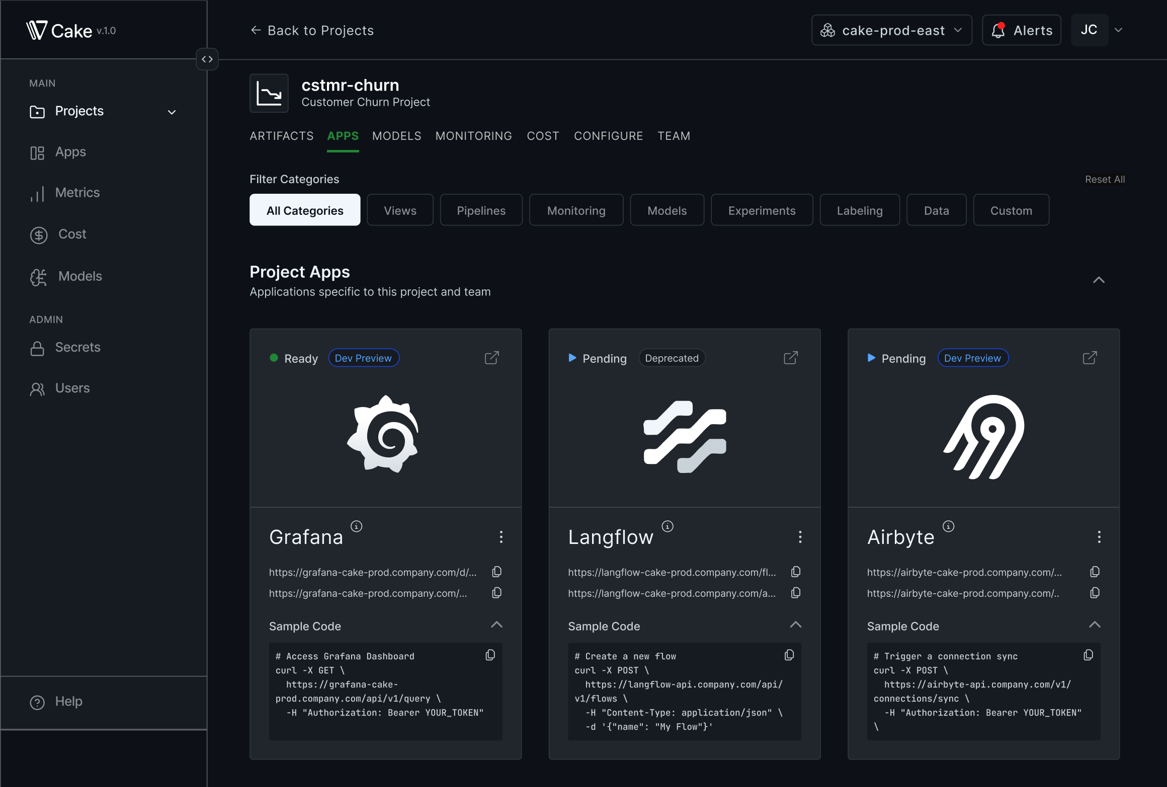 Cake brings your data, models, and orchestration together in a control plane designed to work with best-in-class open-source tools. Build with the components you trust while enforcing consistency, auditability, and scale.